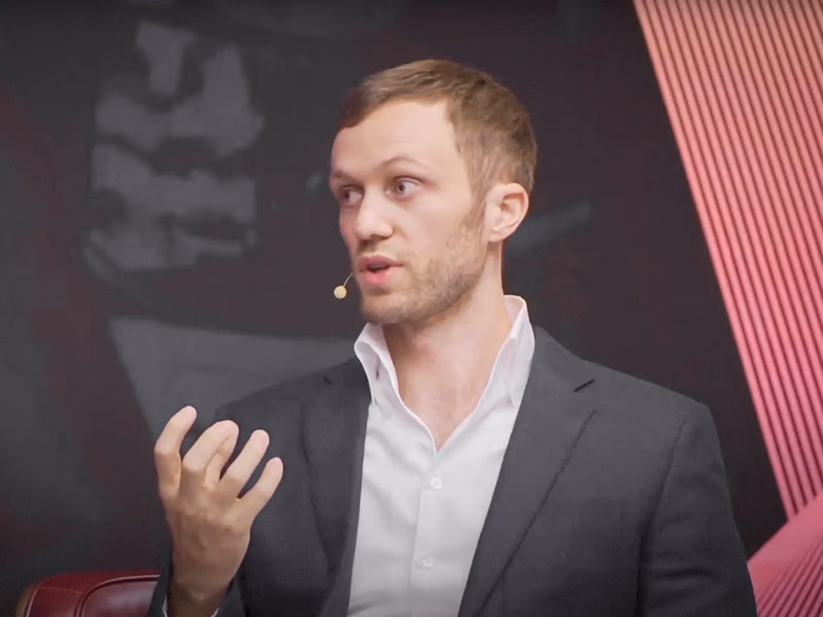 Three men in a business meeting with a laptop and documents, one man speaking with hands raised.